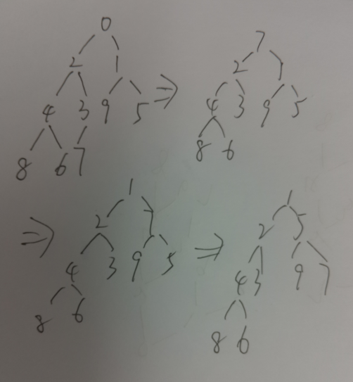【0、2、1、4、3、9、5、8、6、7】是以数组形式存储的最小堆,删除堆顶元素0后的结果是()